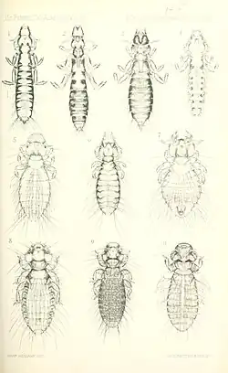 Ilustrações do livro "Compreendendo: Mallophaga de pássaros do Panamá, Baja California e Alaska", repare que a cabeça é mais larga que o tórax nesses indivíduos.