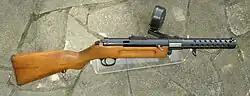 Em 1969, a Steyr lançou a MPi 69, que tem aparência semelhante à da submetralhadora Uzi.[29] O receptor da MPi 69 é um tubo quadrado de aço estampado que se encaixa parcialmente dentro de uma grande peça moldada em plástico (semelhante a um receptor inferior) que contém a empunhadura frontal, a empunhadura vertical e o grupo de controle de disparo,[29] tornando a MPi 69 uma das primeiras armas de fogo a utilizar construção em plástico dessa maneira.