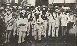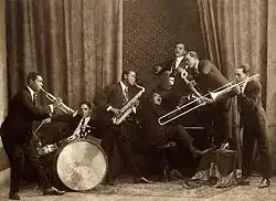 Em 1919, juntamente com seu irmão China, Donga, João Pernambuco e outros músicos proeminentes, remanescentes do Grupo do Caxangá, formou o grupo Oito Batutas,[10][11] criado a pedido de Isaac Frankel, gerente do Cine Palais, para tocar na sala de espera do cinema e atrair público.[12] Estreando em 7 de abril,[3] a formação instrumental era a princípio bastante tradicional, dominada por uma seção rítmica de cordas dedilhadas: violões, cavaquinho e banjo, mais Pixinguinha na flauta e percussão manual. Apresentando-se no saguão do cinema Cine Palais, os Oito Batutas logo se tornaram uma atração mais popular do que os próprios filmes.[13][14] Seu repertório era diversificado, abrangendo música folclórica do nordeste do Brasil, sambas, maxixes, valsas, polcas e "tangos brasileiros" (o termo "choro" ainda não estava estabelecido como gênero). O grupo apelou especialmente para os desejos nacionalistas dos brasileiros de classe alta que ansiavam por uma tradição musical exclusivamente brasileira, livre de influências estrangeiras. Os Oito Batutas se tornaram uma sensação, embora tenham gerado alguma polêmica, irritando parte da elite branca do Rio de Janeiro que não gostava de homens negros se apresentando em casas de espetáculos.[15] Não eram todos negros, mas a presença de alguns foi o bastante.[16] A despeito das críticas racistas, o grupo tocou na recepção para o rei Alberto I da Bélgica,[17] foi admirado por personalidades como Gilberto Freyre, Sérgio Buarque de Holanda, Rui Barbosa, Irineu Marinho, Menotti del Picchia e Pinheiro Machado, e inspirou a criação de diversos conjuntos "sertanejos" ao longo da década de 1920, os quais, segundo Virgínia Bessa, "desempenharam papel importantíssimo na criação e divulgação da música nacional".[18]