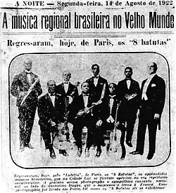 - "A guerra que lhes fizeram foi atroz. Como os músicos eram bons, batutas de verdade, violeiros e cantadores magníficos; como a flauta de Pixinguinha fosse melhor do que qualquer flauta por aí saída com dez diplomas de dez institutos — começaram os despeitados a alegar a cor dos Oito Batutas, na maioria pretos. Segundo os descontentes, era uma desmoralização para o Brasil, ter na principal artéria de sua capital uma orquestra de negros! Que iria pensar de nós o estrangeiro? Os Oito Batutas não desmoralizarão o Brasil na Europa. Ao contrário. Levarão dentro de seus violões toda a alma cantante do Brasil. Levarão o Brasil tal qual ele é no seu sentimento e na sua beleza. Levarão verdadeira música brasileira, essa que ainda não foi contaminada pelas influências alheias e que vibra e que sofre e que geme por si, cantando luares do sertão e olhos de caboclas".[3]