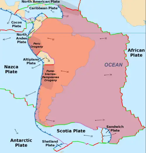 - ↑ «South American Plate: Tectonic Boundary and Movement». Earth How (em inglês). 18 de março de 2018. Consultado em 3 de setembro de 2021