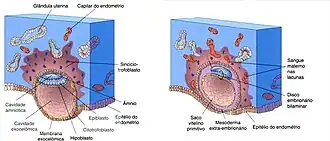 Com a implantação as células do tecido conjuntivo endometrial sofrem uma transformação - a reação decidual. Com a acumulação de glicogênio e lipídios em seu citoplasma, as células ficam intumescidas e são conhecidas como células deciduais. A principal função delas é fornecer ao ‘concepto humano’ um sítio imunologicamente privilegiado. No embrião de 12 dias, as lacunas sinciciotrofoblásticas adjacentes fundem-se para formar as redes lacunares que dão ao sinciciotrofoblasto um aspecto esponjoso. As redes lacunares, particularmente as situadas em torno do polo embrionário, são os primórdios dos espaços intervilosos da placenta. Os capilares endometriais em torno do embrião implantado tornam-se congestos e dilatados, forrando os sinusoides – vasos terminais de paredes delgadas e maiores que os capilares comuns. Os sinusoides são erodidos pelo sinciciotrofoblasto, e o sangue materno flui livremente para o interior das redes lacunares. O trofoblasto absorve o fluido nutritivo das redes lacunares, que é, então, transferido ao embrião. O crescimento do disco embrionário bilaminar é lento comparado com o crescimento do trofoblasto. O embrião implantado no 12º dia produz na superfície endometrial uma pequena elevação que se projeta para a luz uterina. Enquanto ocorrem mudanças no trofoblasto e no endométrio, o mesoderma extra embrionário cresce e surgem no seu interior espaços celômicos extra-embrionários isolados. Estes espaços fundem-se rapidamente e formam uma grande cavidade isolada, o celoma extra-embrionário essa cavidade preenchida por fluido envolve o âmnio e o saco vitelino, exceto onde eles estão aderidos ao córion pelo pedúnculo do embrião. Com a formação do celoma extra-embrionário, o saco vitelino primitivo diminui de tamanho e se forma um pequeno saco vitelino secundário. Esse saco vitelino menor é formado por células endodérmicas extraembrionárias que migram do hipoblasto para o interior do saco primitivo. O saco vitelino não tem vitelo, porém exerce importantes funções.