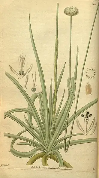 - Xyridaceae C.Agardh, nom. cons. — com 2 subfamílias (Abolbodoideae e Xyridoideae), 5 géneros e cerca de 260 espécies.