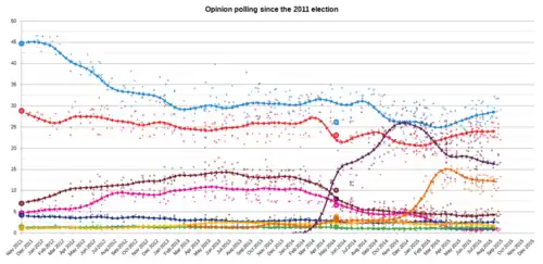 Em outubro de 2014, o barómetro de Metroscopia deu 13,8% de intenção directa de voto, superando o Partido Popular. A aparição de Pablo Iglesias em La Sexta Noche (na que foi entrevistado) elevou a audiência do programa aos 16,2%, sendo o seu máximo histórico. Nos últimos dias de outubro, Podemos já contava com mais de 200 000 membros.