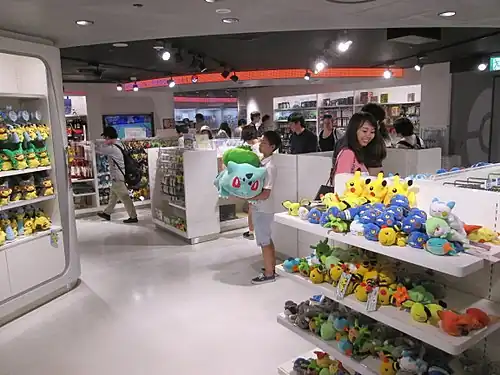 Em 23 de abril de 1998, a Pokémon Center Co. Ltd. foi fundada como uma joint venture entre a Nintendo, a Creatures e a Game Freak.[271] Inicialmente, foi criada para administrar lojas especializadas em produtos Pokémon, chamadas Pokémon Centers, cuja primeira unidade foi inaugurada em Nihonbashi, Tóquio, em 18 de julho de 1998.[272][273] Ao longo dos anos, vários Pokémon Centers abriram e fecharam no Japão. Em setembro de 2025, existiam um total de 23 lojas de produtos Pokémon no Japão.[274] Um Pokémon Center americano também existiu na cidade de Nova Iorque a partir de 2001[275] ao 2005.[276] Foi então remodelado para Nintendo World,[277] mais tarde renomeado Nintendo New York.[278]