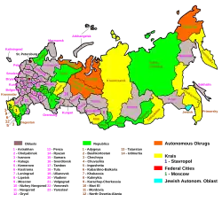 A Federação Russa fez poucas mudanças no padrão soviético de jurisdições regionais. A constituição de 1993 estabelece um governo federal e enumera oitenta e nove jurisdições subnacionais, incluindo vinte e um enclaves étnicos com o status de repúblicas. Existem dez regiões autônomas (okrug) e o Oblast Autônomo Judaico (Yevreyskaya avtonomnaya oblast, também conhecido como Birobidjan). Além das jurisdições etnicamente identificadas, existem seis territórios (kray) e quarenta e nove oblasts (províncias). As cidades de Moscou e São Petersburgo são independentes das jurisdições vizinhas por serem "cidades de significado federal", tendo o mesmo status que os oblasts. As dez regiões autônomas e Birobidjan fazem parte de jurisdições maiores, seja um oblast ou um território. À medida que o poder e a influência do governo central se diluíram, os governadores e prefeitos tornaram-se as únicas autoridades governamentais relevantes em muitas jurisdições.