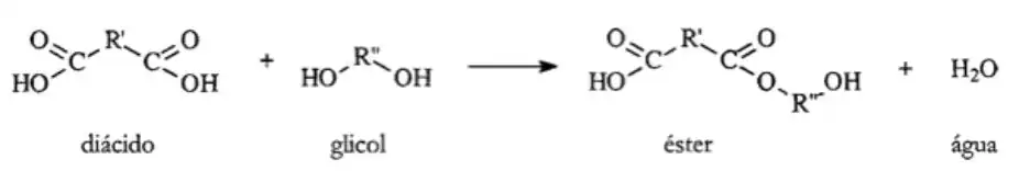 - Polímeros formados através de uma reação de condensação, a partir de dois diferentes tipos de monômeros, bi ou trifuncionais, com eliminação de uma molécula pequena, geralmente a água ou HCl.[3]