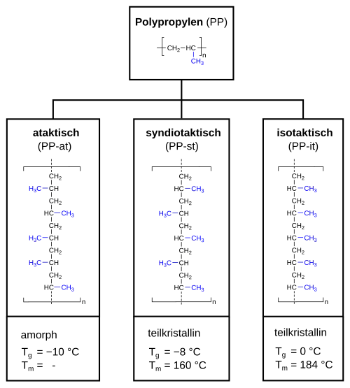 O polipropileno isotático tem alto grau de cristalinidade, variando entre 30-60%, enquanto o polipropileno sindiotático é menos cristalino e o atático apresenta-se no estado amorfo (não-cristalino).[16]
