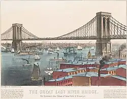 Cromolitografia da "Grande Ponte Pênsil do East River" por Currier and Ives, feita em 1883.