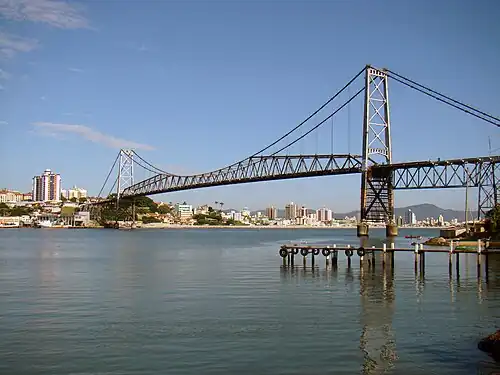 - Ponte Hercílio Luz, inaugurada em 1926, liga a parte continental à parte insular de Florianópolis, no estado de Santa Catarina, Brasil.