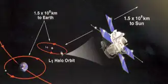 O ponto L1 encontra-se na linha definida entre as duas grandes massas M1 e M2. É o ponto onde a atração gravitacional de M2 e a de M1 se combinam para produzir um equilíbrio. Um objeto que orbita o Sol mais próximo do que a Terra normalmente teria um período orbital mais curto do que a Terra, mas isso ignora o efeito da atração gravitacional da Terra. Se o objeto estiver diretamente entre a Terra e o Sol, a gravidade da Terra neutraliza parte da atração do Sol sobre o objeto, aumentando o período orbital do objeto. Quanto mais próximo da Terra o objeto estiver, maior será esse efeito. No ponto L1, o período orbital do objeto torna-se exatamente igual ao período orbital da Terra. L1 está a cerca de 1.5 milhão de kms, ou 0.01 UA, da Terra na direção do Sol.[1]