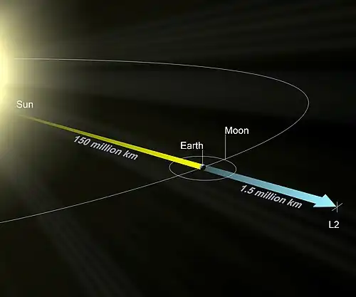 O ponto L2 está na linha que passa pelas duas grandes massas além da menor das duas. Aqui, as forças gravitacionais combinadas das duas grandes massas equilibram o efeito centrífugo em um corpo em L2. No lado oposto da Terra ao Sol, o período orbital de um objeto normalmente seria maior que o da Terra. A atração extra da gravidade da Terra diminui o período orbital do objeto e, no ponto L2, esse período orbital torna-se igual ao da Terra. Como L1, L2 está a cerca de 1.5 milhão de kms ou 0.01 UA da Terra (longe do Sol). Um exemplo em L2 é o Telescópio Espacial James Webb, projetado para operar perto da Terra-Sol em L2.[8] Exemplos anteriores incluem o Wilkinson Microwave Anisotropy Probe e seu sucessor, Planck.