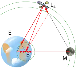 • Os pontos Terra-Lua L4 e L5 contêm concentrações de poeira interplanetária, conhecidas como nuvens de Kordylewski.[13][14] A estabilidade nesses pontos específicos é muito complicada pela influência gravitacional solar.[15]