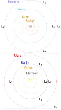• Os pontos Sol-Terra L4 e L5 contêm poeira interplanetária e pelo menos dois asteroides, 2010 TK7 e 2020 XL5.[10][11][12]