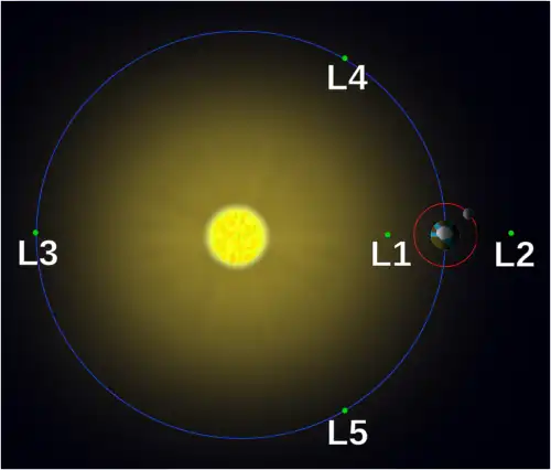 Pontos de Lagrange no sistema Sol-Terra (sem escala). A órbita da Terra aqui é no sentido anti-horário