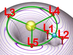 Os cinco pontos de Lagrange são rotulados e definidos da seguinte forma: