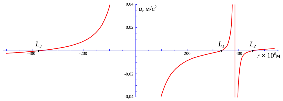 onde r é a distância do grande corpo M1, R é a distância entre os dois objetos principais e sgn(x) é a função sinal de x. Os termos desta função representam respectivamente: força de M1; força de M2; e força centrípeta. Os pontos L3, L1 e L2 ocorrem onde a aceleração é zero, veja o gráfico à direita. A aceleração positiva é a aceleração para a direita do gráfico e a aceleração negativa é para a esquerda; é por isso que a aceleração tem sinais opostos em lados opostos dos poços de gravidade.