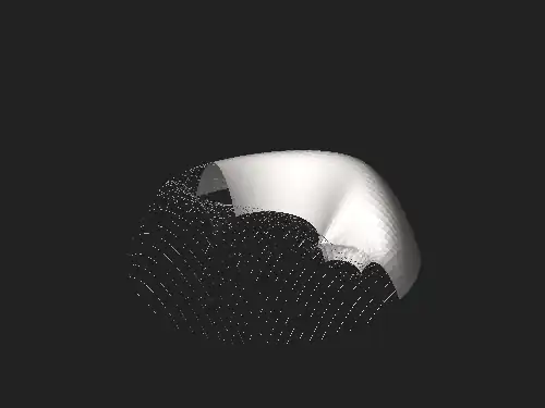 Modelo STL 3D do potencial de Roche de dois corpos em órbita, renderizado metade como uma superfície e metade como uma malha