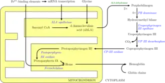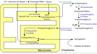 A síntese do heme se dá em dois locais distintos da célula e envolve oito enzimas. Ela começa na mitocôndria (com a primeira enzima atuando), prossegue no citoplasma (com quatro enzimas atuando), e volta para a mitocôndria, onde é encerrada (com as três últimas enzimas atuando).