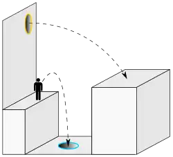 Em Portal, o jogador controla a protagonista, Chell, de uma perspectiva de primeira-pessoa durante o seu desafio de passar por uma série de salas usando a "Aperture Science Handheld Portal Device" ("ASHPD" ou "Portal Gun"; em português, "Arma de Portais"). A Arma de Portais é capaz de criar dois fins distintos de portais, um laranja e um azul. Os portais criam uma conexão visual e física entre dois locais diferentes no espaço tridimensional. Um portal é a entrada e/ou saída do outro portal, e vice-versa; todos os objetos que passam por um portal irão sair pelo outro. Um aspecto importante da física do jogo é o "redirecionamento do movimento linear"("Momentum").[11] Isto faz com que um objeto que passa por um portal saia na mesma direção e da mesma maneira pelo outro portal. Isto faz com que seja possível pular em um portal e emergir movendo-se em direções diferentes pela sala.[12] Por exemplo, uma manobra comum é pular em um portal que está no chão e emergir pelo outro pela parede, sobrevoando uma fenda ou outro obstáculo (vide ilustração). Isto permite que o jogador lance objetos ou a própria Chell em grandes distâncias, ambos vertical e horizontalmente, o que é referido pela Valve como "flinging" (em português, "arremesso").[11] E como GLaDOS fala: "Em termos de leigos, coisinha rápida entra, coisinha rápida sai". Se os portais não estão em planos paralelos, o personagem quando passa por eles é reorientado para sair de pé, sempre respeitando a gravidade após sua saída.
