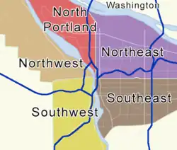 As cinco seções atuais de endereçamento de Portland, que são conhecidas como quadrantes apesar de existirem cinco, desenvolveram identidades distintas, com diferenças culturais moderadas e rivalidades amistosas entre seus residentes, especialmente entre aqueles que vivem a leste do rio Willamette. contra o oeste do rio.[7] As seções de endereçamento de Portland são Norte, Noroeste, Nordeste, Sudeste e Sudoeste (que inclui o centro de Portland ). O rio Willamette divide a cidade em leste e oeste, enquanto Burnside Street, que percorre toda a cidade longitudinalmente, divide o norte do sul. Todos os endereços e ruas dentro da cidade são prefixados por N, NW, NE, SW ou SE, com exceção de Burnside Street, que é prefixado com W ou E. A partir de maio de 2020, os endereços dos bairros de South Portland com números residenciais abandone o zero e o prefixo de rua será convertido para o sul a partir do sudoeste. Por exemplo, o endereço atual 0246 SW California St. se tornará 246 S. California St. em vigor em maio de 2020.