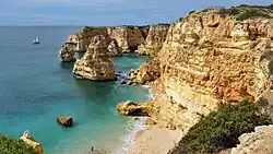 Portugal, oficialmente República Portuguesa,[10][h] é um país soberano[i] unitário localizado no sudoeste da Europa, cujo território se situa na zona ocidental da Península Ibérica e em arquipélagos no Atlântico Norte. O território português tem uma área total de 92 090 km²,[11] sendo delimitado a norte e leste pela Espanha e a sul e oeste pelo oceano Atlântico, compreendendo uma parte continental e duas regiões autónomas: os arquipélagos dos Açores e da Madeira. Portugal é a nação mais a ocidente do continente europeu. O nome do país provém da sua segunda maior cidade, Porto, cujo nome latino-celta era Portus Cale.[12][13]