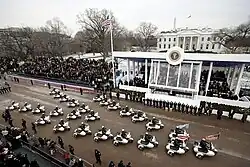 Logo após o juramento de posse do presidente, a Banda de Fuzileiros Navais dos Estados Unidos performa plissados e floreios, seguindo pelo tradicional hino Hail to the Chief, enquanto um regimento do Exército dispara uma salva de 21 tiros de canhão ao norte do Capitólio.