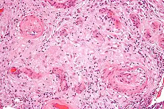 | Uma micrografia mostrando a vasculopatia decidual hipertrófica, uma característica vista na hipertensão gestacional e pré-eclâmpsia. Coloração H&E. | |