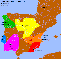 O centro tecnológico da Idade do Bronze na Península Ibérica foi o sudoeste a partir de c.1 800 a.C..[3] Aí, nas regiões de Almería, Granada e Múrcia, a Cultura de Los Millares foi substituída pela de El Argar com o aparecimento gradual de ferramentas de bronze e de povoados fortificados de grande dimensão. Afirma-se o poder político acima dos clãs e famílias primordiais, e muda bruscamente a organização social, nascendo uma vida urbana mais próxima da atual. Deste centro a tecnologia do bronze estendeu-se a outras regiões, constituindo o substrato onde viria a desenvolver-se a cultura Ibera e mais tarde os Tartessos. A rede de relações e comunicações criada por estes povos entre si viria a permanecer quase intacta até à chegada dos romanos à Península.