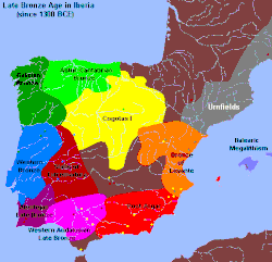 No bronze final, cerca de 1 300 a.C. deram-se várias grandes mudanças na Península. A cultura calcolítica de Vila Nova desaparece, possivelmente devido ao assoreamento do canal que ligava a cidade de Zambujal ao mar.[5] A cultura unificada de El Argar também desaparece, restando diversas cidades fortificadas dispersas. Os primeiros celtas, da Cultura dos Campos de Urnas surgem a partir de noroeste, conquistando toda a Catalunha e algumas áreas vizinhas. O vale do Guadalquivir assiste ao nascimento da sua primeira cultura diferenciada que poderá estar relacionada com os míticos Tartessos;