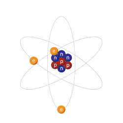 Representação esquemática do modelo atômico de Bohr: os prótons, de carga positiva, e os nêutrons, sem carga, constituem o núcleo. Ao redor giram os elétrons, de carga negativa.