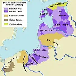 Durante 60 anos de lutas contra os antigos prussianos, a Ordem estabeleceu um estado independente que passou a controlar Prūsa. Depois que os Irmãos Livônios da Espada se juntaram à Ordem Teutônica em 1237, a Ordem também controlou a Livônia (hoje Letônia e Estônia). Por volta de 1252, eles concluíram a conquista da tribo prussiana mais ao norte, os escalvianos, bem como dos curônios do Báltico ocidental, e ergueram o Castelo de Memel, que se tornou a principal cidade portuária de Memel. O Tratado de Melno definiu a fronteira final entre a Prússia e o vizinho Grão-Ducado da Lituânia em 1422. [5]