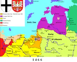 A Guerra dos Treze Anos (1454–1466) começou quando a Confederação Prussiana, uma coalizão de cidades hanseáticas da Prússia ocidental, se rebelou contra a Ordem e pediu ajuda ao rei polonês, Casimiro IV Jagelão. Os Cavaleiros Teutônicos foram forçados a reconhecer a soberania e a pagar tributo a Casimiro IV na Segunda Paz de Thorn (1466), perdendo a Prússia Ocidental (Prússia Real) para a Polônia no processo. De acordo com a Segunda Paz de Thorn, dois estados prussianos foram estabelecidos. [12]