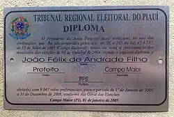 O prefeito é eleito por voto direto e secreto, com mandato de quatro anos, podendo ser reeleito para um único período subsequente. A eleição ocorre no primeiro domingo de outubro do último ano do mandato anterior.