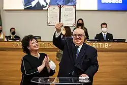 Rafael Greca de Macedo em cerimônia de posse de seu terceiro mandato como prefeito na Câmara Municipal de Curitiba, no Paraná. A data de posse dos prefeitos e prefeitas eleitos a cada 4 anos é no dia 1º de janeiro.