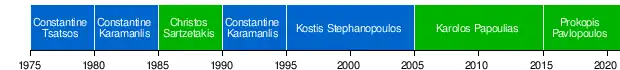 - Konstantinos Stephanopoulos: 10 de março de 1995 – 12 de março de 2005: eleito pelo parlamento, dois mandatos consecutivos