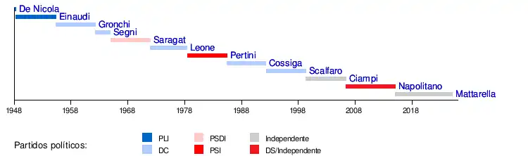 A Constituição italiana não prevê um limite para o número de mandatos no que diz respeito ao cargo de Presidente da República. O primeiro caso de reeleição do presidente cessante data de 20 de abril de 2013 com a eleição de Giorgio Napolitano.[2]