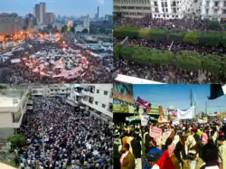 Do topo, em sentido horário: Revolução Egípcia, Revolução Tunisiana, Revolução Líbia e protesto no Iêmen.