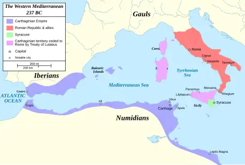 A guerra durou 23 anos, o conflito mais longo da história greco-romana e a maior guerra naval da história da Antiguidade.[165] Após seu fim, Cartago tentou evitar pagar totalmente as tropas estrangeiras que tinham lutado na guerra. Elas acabaram se revoltando e receberam o apoio de muitos grupos locais insatisfeitos.[166][167][168] A revolta foi subjugada com grande dificuldade e com selvageria considerável. Cartago preparou em 237 a.C. uma expedição para recuperar a Sardenha, que tinha sido perdida para os rebeldes.[169][170] Os romanos, cinicamente, afirmaram que considerariam isso um ato de guerra. Seus termos de paz eram a entrega de Sardenha e Córsega e o pagamento de mais 1,2 mil talentos de indenização.[nota 10] Cartago, enfraquecida por trinta anos de guerra, concordou com os termos em vez de entrar em mais um conflito contra Roma; o pagamento adicional e a renúncia das duas ilhas foram adicionadas ao Tratado de Lutácio como uma cláusula adicional.[1][171] Estas ações romanas aumentaram o ressentimento cartaginês, que não se conformava com a percepção de Roma sobre sua situação, sendo considerados fatores contribuintes para o início da Segunda Guerra Púnica em 218 a.C..[171]