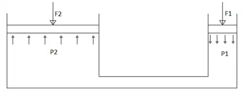 Ao observar a imagem da prensa hidráulica, podemos considerar que uma força é aplicada no pistão da direita (de área ) gerando uma pressão . Como o princípio de Pascal descreve, a pressão será transmitida integralmente pelo liquido gerando assim uma pressão no pistão esquerdo, equivalente a . Ou seja .