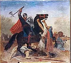 Iluminura medieval de Ademar de Monteil (com a mitra) empunhando a lança do destino numa batalha da Primeira Cruzada