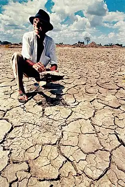 Secas e enchentes são fenômenos naturais recorrentes no Brasil. Estão vinculados à variabilidade natural das estações, mas o aquecimento global coloca importantes fatores adicionais para seu agravamento, estando entre os seus principais impactos no caso brasileiro. As secas são mais intensas na Região Nordeste, onde o clima é por natureza semiárido, delimitando o chamado polígono das secas, onde os efeitos sobre o ambiente e a população são mais sentidos, prejudicando especialmente a agropecuária, e, por consequência, a sociedade. As secas nordestinas se tornaram lendárias, e deram origem a grande bibliografia e mesmo a obras de arte, romances e filmes, que enfocaram seus variados efeitos, sobretudo o desencadeamento de grandes migrações de populações para outras regiões do país, fugindo das ásperas condições de vida no Nordeste provocadas pelas calamidades climáticas.[61][62] A seca de 2012, por exemplo, afetou mais de dez milhões de pessoas e deixou um prejuízo de mais de 16 bilhões de reais.[63] No ano seguinte o fenômeno se repetiu ainda pior, considerado pela ONU o mais grave dos últimos 50 anos, colocando 1.200 municípios em estado de emergência. Só na Paraíba, 360 mil cabeças de gado morreram.[64][65][66]