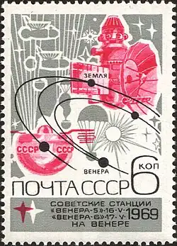 - A Venera 5 alcançou Vênus em 16 de maio de 1969 e entrou na atmosfera de Vênus no mesmo dia, enviando dados à Terra antes de ser esmagada pela atmosfera. Cada nave (Venera 5 e 6) carregava um módulo de pouso, dotado de paraquedas, além de instrumental científico. Também carregavam medalhões comemorativos com as insígnias soviéticas e o baixo-relevo de Lênin. A Venera 5 lançou o seu módulo de pouso no lado escuro de Vênus em 16 de maio de 1969, e a Venera 6 o fez no dia seguinte.