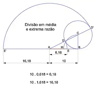 - Euclides (325–265 a.C.), em sua obra Os Elementos, registrou a construção geométrica divisão em média e extrema razão (em grego: ἄκρος καὶ μέσος λόγος).[40]