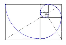 Em geometria, o retângulo de ouro surge do processo de divisão em média e extrema razão, de Euclides. Ele é assim chamado porque ao dividir-se a base desse retângulo pela sua altura, obtêm-se o número de ouro 1,618. A cada etapa em que um retânculo é seccionado, retirando-se um quadrado de sua extremidade, surge outro retângulo conguente.[18]
