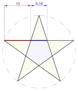 Chamando os vértices de um pentagrama de A, B, C, D e E, o triângulo isósceles formado por A, C e D tem seus lados em relação dourada com a base, e o triângulo isósceles A, B e C tem sua base em relação dourada com os lados.