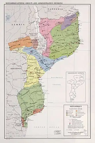 A esmagadora maioria da população era composta por grupos bantus, distribuídos em diferentes regiões. No norte, eram predominantes os Makua e Lomwe, próximos a Nampula e Cabo Delgado, eram agricultores de subsistência e criadores de gado. Também no norte, habitavam os Yao, ligados historicamente ao comércio de marfim e escravos, com forte presença muçulmana. Concentrados no centro, estavam os Sena e os Shona,que habitavam as margens do Zambeze e em Manica. Praticavam agricultura e estavam conectados ao comércio de ouro e marfim. Predominantes no sul, estavam os Tsonga, próximos a capital Lourenço Marques, frequentemente empregados em trabalhos agrícolas e migratórios para a África do Sul. O crescimento natural da população africana foi marcado por períodos de declínio em função das guerras, epidemias e trabalho forçado. No século XX, milhões de africanos foram submetidos ao chibalo ou recrutados como trabalhadores imigrantes para minas e plantações na África do Sul e Rodésia, afetando a estrutura social e familiar local.[43]