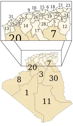 Imediatamente após a independência da Argélia, optou-se por retomar a divisão em quinze départements, vigente na época da colonização francesa, transformando a maior parte deles em vilaietes (províncias) em 1968, com algumas alterações nos seus nomes: