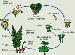 O esporófito produz esporângios onde, por meiose, se formam esporos haploides que dão origem ao gametófito, uma planta haploide multicelular que irá produzir gametas, assegurando assim a reprodução assexuada da espécie.[3] Os esporos possuem metade do número cromossômico (n) do esporófito (2n), e, ao caírem no solo em condições favoráveis de nutrientes e água, germinam dando origem ao protalo. O protalo é um indivíduo de vida curta que produz gametas para dar origem a uma nova planta.