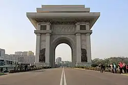 Alguns notáveis monumentos da cidade incluem o Palácio do Sol de Kumsusan, o Arco do Triunfo, a Torre Juche, uma estrutura de 170 metros de altura, erguida para comemorar o 70º aniversário de Kim Il-Sung e o Estádio Primeiro de Maio Rungrado, considerado o maior estádio do mundo.[25] Outras atrações na capital norte-coreana incluem o Zoológico Central e as grandes estátuas de bronze em homenagem aos dois líderes comunistas da Coreia do Norte (Grande Monumento da Colina Mansu).